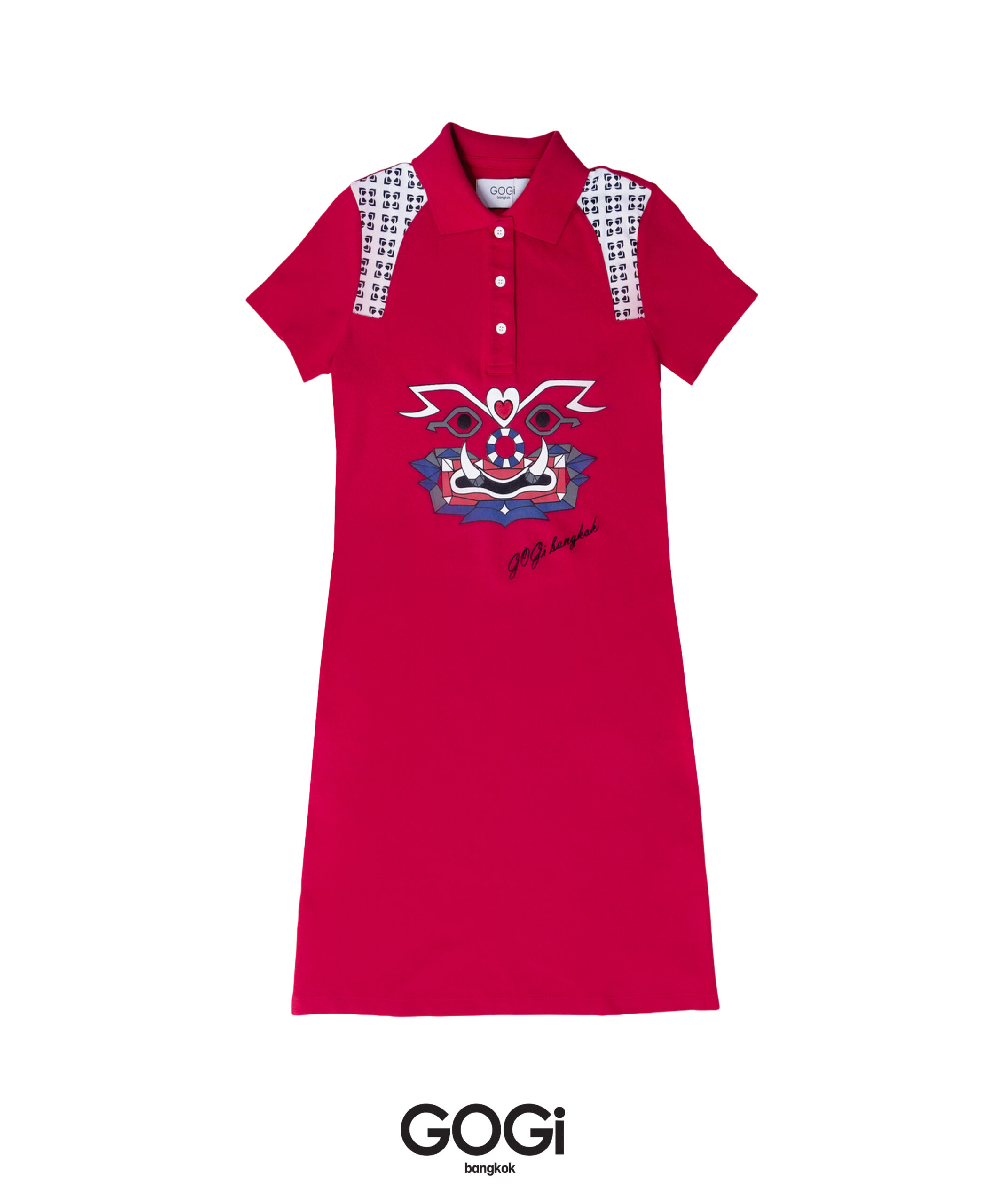 A polo dress made from warp-knit fabric and micro tricot, which is a soft breathable texture, and stays its shape. The details include embroidered and printed “Yak” (giant) designs. The shoulders feature patterns inspired by traditional Thai design the “Prajam Yam or Dok Jan”(Asterisk-like) patterns, which is meaningful in Thai culture. These patterns are commonly found in temples, monasteries, palaces, or any traditional structures. They are believed to offer protection and ward off negativity. As a result, these patterns have become the main inspiration for this collection.